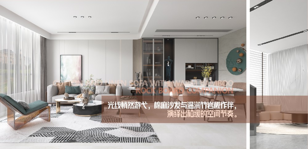 在這個精裝房盛行的時代,我們的生活被公式化標準化,一棟棟建筑里同樣的材質和形式,被壓抑住的個性無從施展。而竹巖板打造的空間成就了業主第一眼的視覺焦點,白色墻板拼接搭配不同色系不同型號肌理墻板,淺淺木色搭配集功能與形式結合的金屬線條讓視覺上有了延續,理想生活家的儀式感倍增。&n···